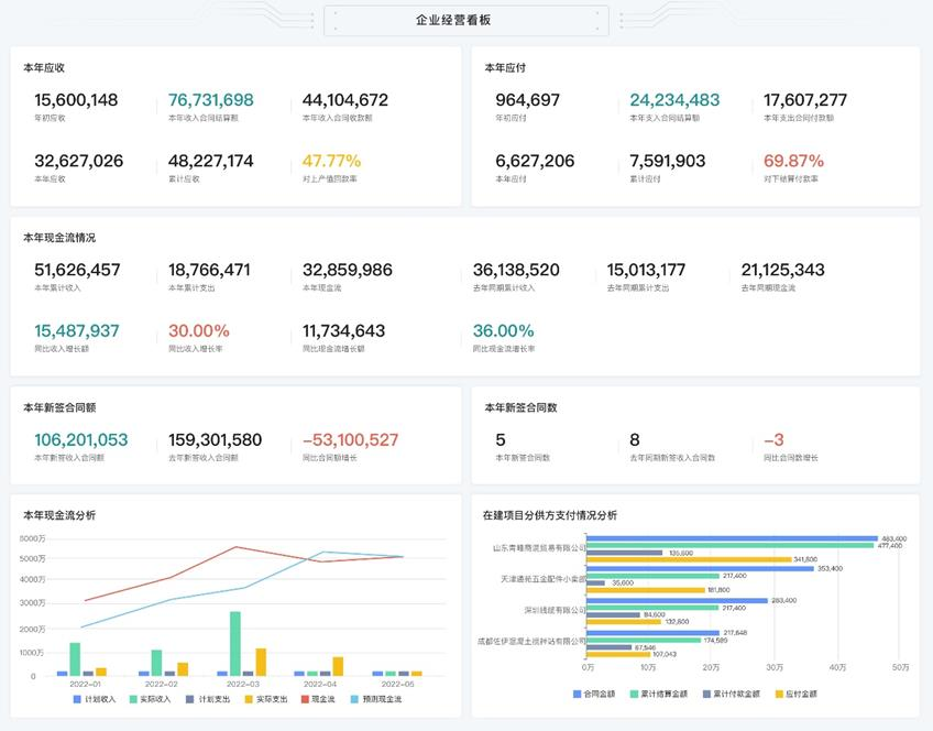 在數(shù)字換轉(zhuǎn)型的政策推動(dòng)下,傳統(tǒng)工程企業(yè)也開(kāi)啟了數(shù)字化轉(zhuǎn)型的發(fā)展新進(jìn)程。在轉(zhuǎn)型初期,引進(jìn)數(shù)字化管理工具能夠起到快速梳理和規(guī)范內(nèi)部管理的作用,再配合平臺(tái)大數(shù)據(jù)的信息互通,老板通過(guò)一個(gè)軟件就能夠隨時(shí)掌控企業(yè)現(xiàn)金流盈虧數(shù)據(jù),從而保證了企業(yè)現(xiàn)金流的良性周轉(zhuǎn)。