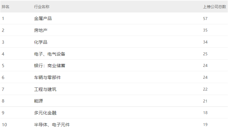 據(jù)上圖所示,根據(jù)上榜公司總數(shù)排名,工程與建筑行業(yè)公司總數(shù)為22,位列第七。